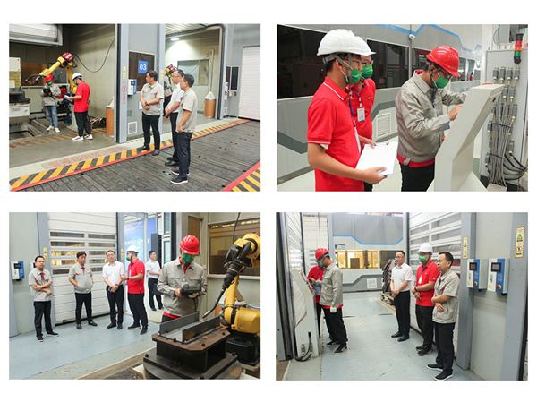 在攪拌車自動焊接線實操考試現場,選手們對機器人進行編程、設置參數,根據工件需要焊接的位置,反復調整機器人的運動軌跡,力求做到焊接時的準確度。裁判員們根據程序編寫、焊接效率、焊接位置、焊縫完整度等指標進行評判。賈主席一行在考試工位前駐足,不時詢問設備運行情況,詳細了解選手們操作流程,對大家精彩表現表示肯定。